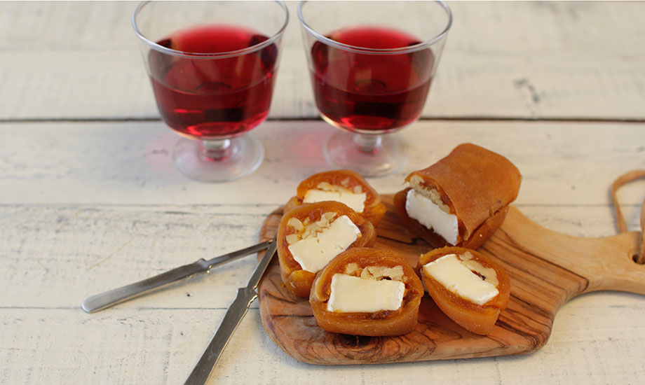 あんぽ柿を開いて、厚切りのル・ルスティック ブリーとクルミを包み込みました。